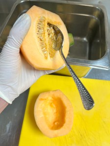 Als nächsten Schritt halbierst du die Melone. Am besten lässt du sie einfach so stehen wie sie ist und schneidest sie einmal von oben durch. Bei den nun offenen Hälften erkennst du direkt die vielen Kerne, die wir getrost entfernen können. Dazu nimmst du einfach einen Esslöffel und löffelst die Kerne raus.
